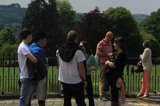 After walking all the way around and taking lots more pictures, we handed down to the Royal Crescent. This architectural landmark was made by the same man who made the Circus. These townhouses make a giant crescent as the name implies. There were lots more people here including a man dressed in 19th century garb who was chatting up the visitors and giving them historical tidbits. One such item was that the leaders of the American Revolution came to Bath and sat in one of the rooms in the Royal Crescent to discuss the war, presumably with British leaders.